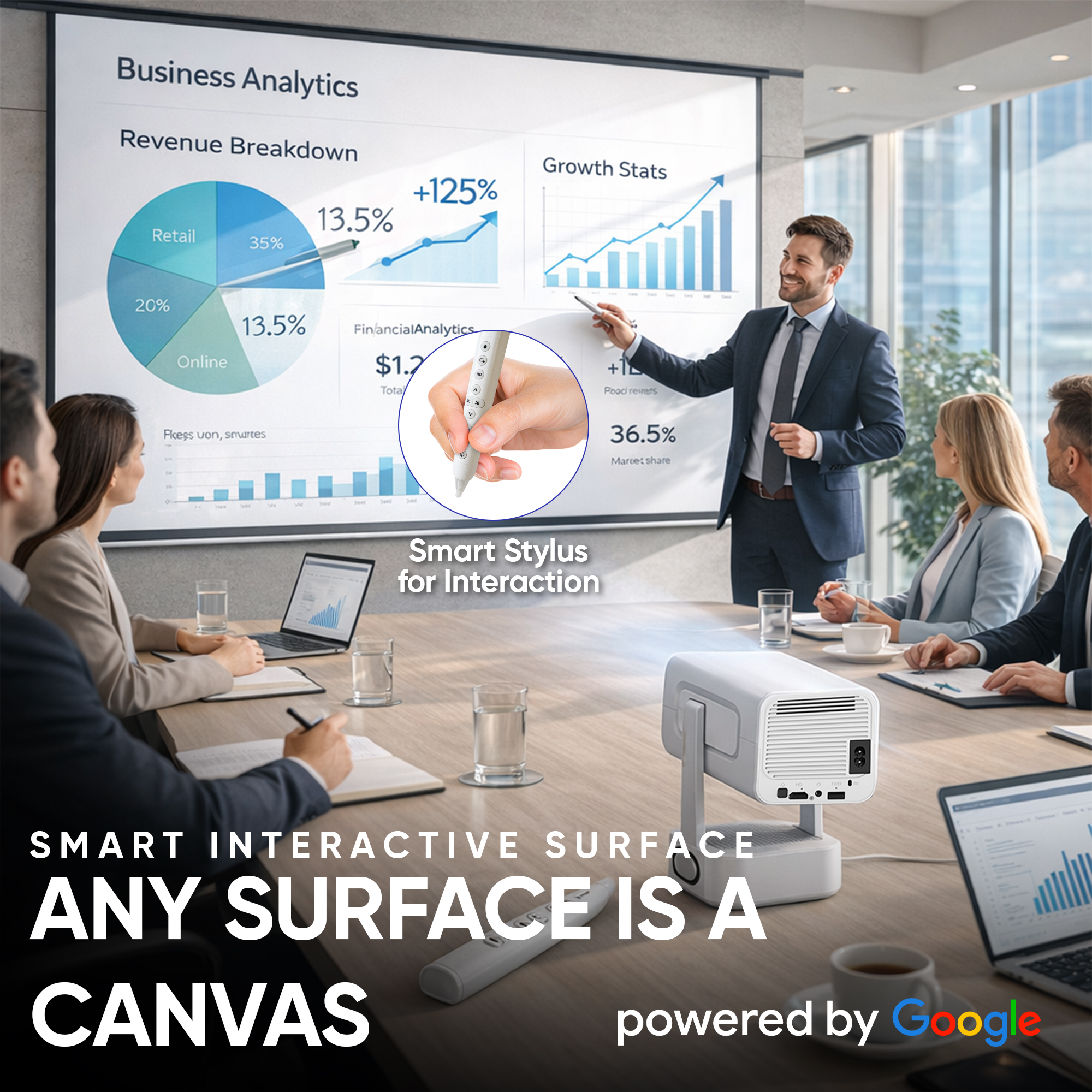 The Debonair Smart Surface Studio™ transforms any wall, table, or surface into an interactive smart display. Designed for homes, classrooms, and business collaboration, this innovative touchscreen projector allows users to write, draw, navigate apps, and control content directly on the projected screen using a smart stylus.
